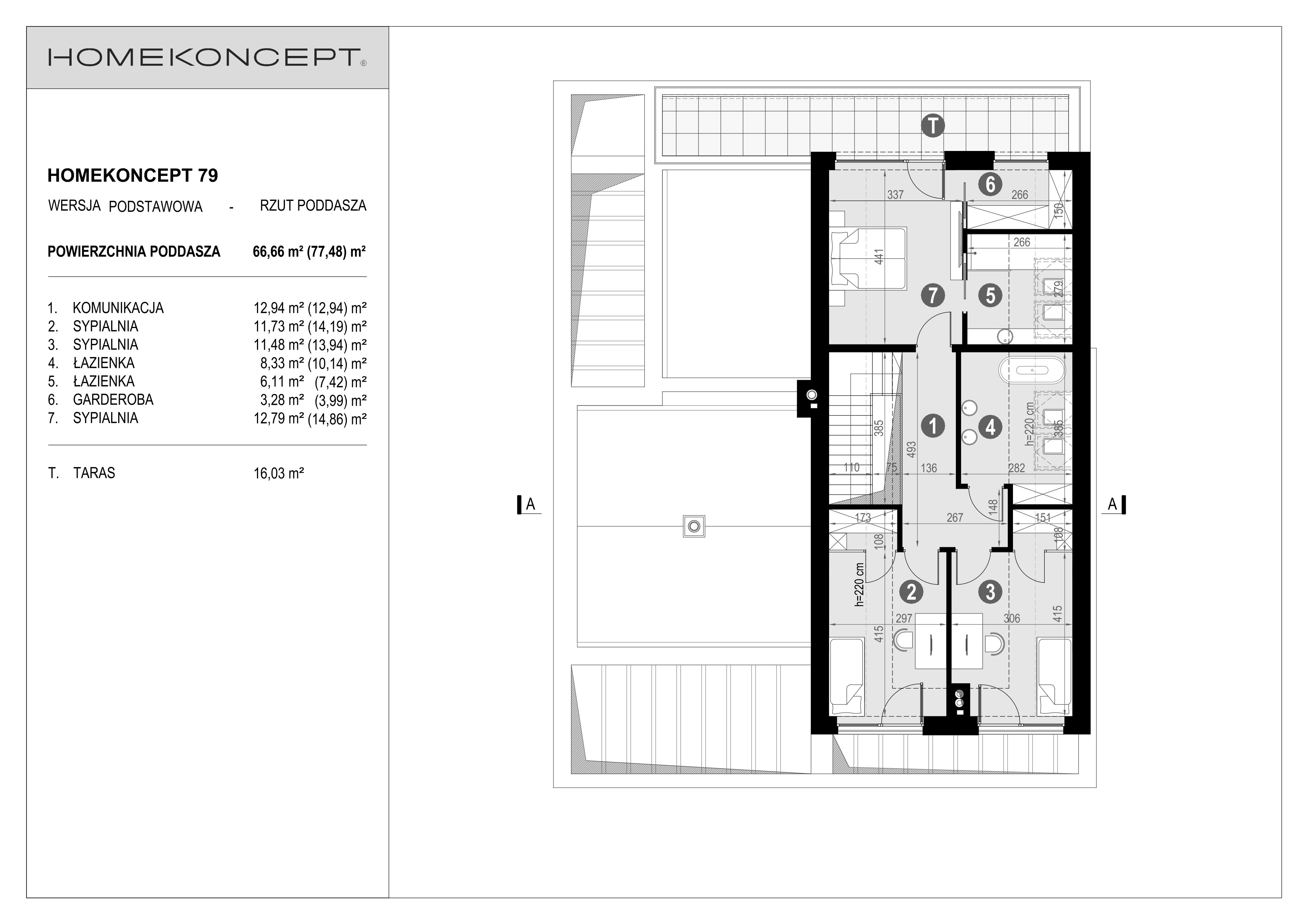 RZUT PODDASZA POWIERZCHNIA: 66,66 m² (77,48 m²) 1. KOMUNIKACJA – 12,94 m² 2. SYPIALNIA – 11,73 m² (14,19 m²) 3. SYPIALNIA – 11,48 m² (13,94 m²) 4. ŁAZIENKA – 8,33 m² (10,14 m²) 5. ŁAZIENKA – 6,11 m² (7,42 m²) 6. GARDEROBA – 3,28 m² (3,99 m²) 7. SYPIALNIA – 12,79 m² (14,86 m²) T. TARAS – 16,03 m²