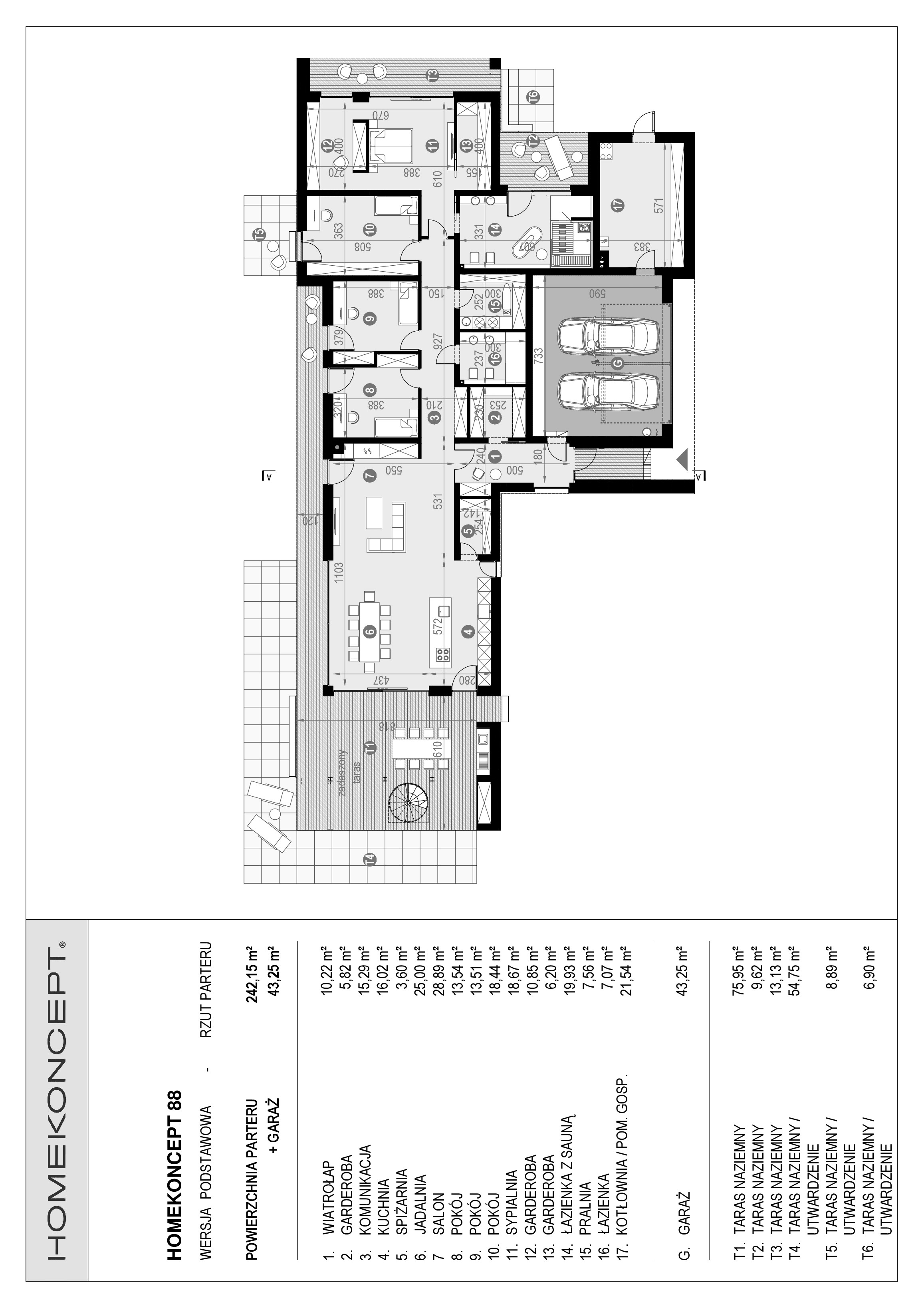 RZUT PARTERU POWIERZCHNIA: 242,15 m² 1. WIATROŁAP – 10,22 m² 2. GARDEROBA – 5,82 m² 3. KOMUNIKACJA – 15,29 m² 4. KUCHNIA – 16,02 m² 5. SPIŻARNIA – 3,60 m² 6. JADALNIA – 25,00 m² 7. SALON – 28,89 m² 8. POKÓJ – 13,54 m² 9. POKÓJ – 13,51 m² 10. POKÓJ – 18,44 m² 11. SYPIALNIA – 18,67 m² 12. GARDEROBA – 10,85 m² 13. GARDEROBA – 6,20 m² 14. ŁAZIENKA Z SAUNĄ – 19,93 m² 15. PRALNIA – 7,56 m² 16. ŁAZIENKA – 7,07 m² 17. KOTŁOWNIA/POM.GOSP. – 21,54 m² G. GARAŻ – 43,25 m² T1. TARAS – 75,95 m² T2. TARAS – 9,62 m² T3. TARAS – 13,13 m² T4. TARAS – 54,75 m² T5. TARAS – 8,89 m² T6. TARAS – 6,90 m²